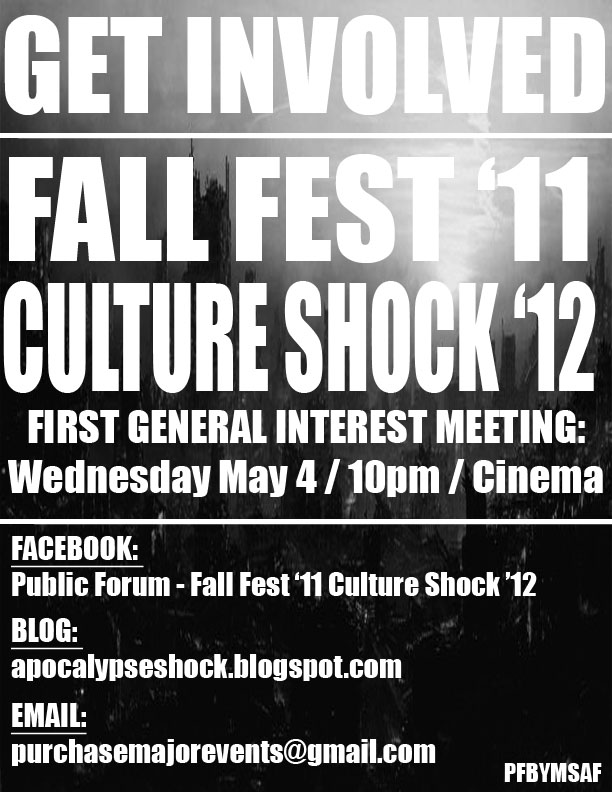 This blog will be updated according to meetings for Fall Fest '11 and Culture Shock '12 held throughout the school year!